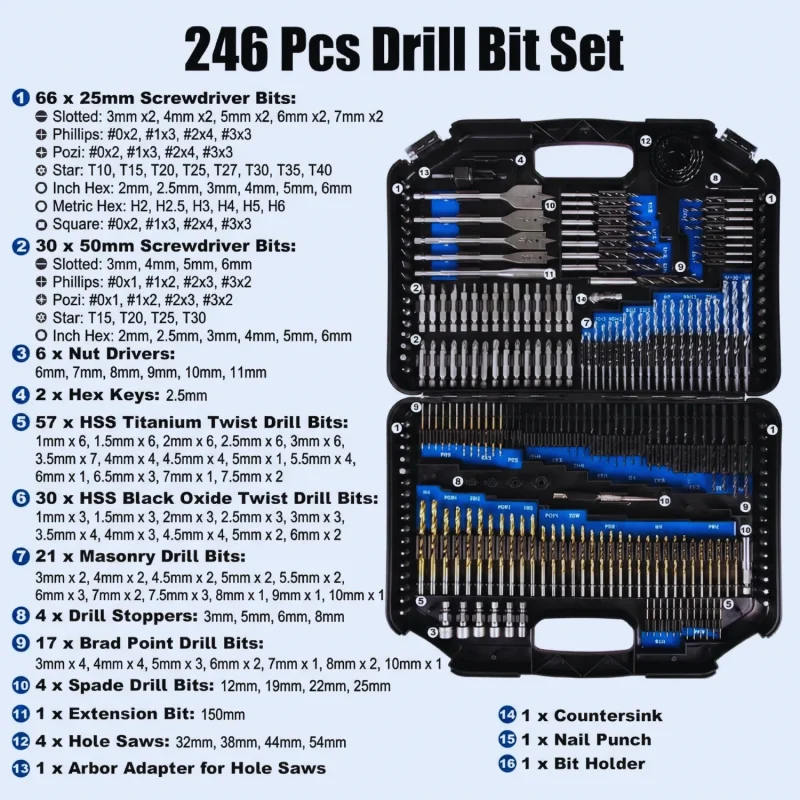 - Ολοκληρωμένη κάλυψη: 246 τεμάχια καλύπτουν τις ανάγκες διάτρησης, διάτρησης και διάτρησης σε ένα σετ
