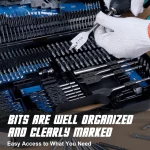 Κάθε θήκη της θήκης αποθήκευσης έχει μπλε ετικέτες που υποδεικνύουν το μέγεθος του κομματιού. Η οργανωμένη διάταξη καθιστά εύκολη την εύρεση και την επαναφορά των bits στη σωστή τους θέση.