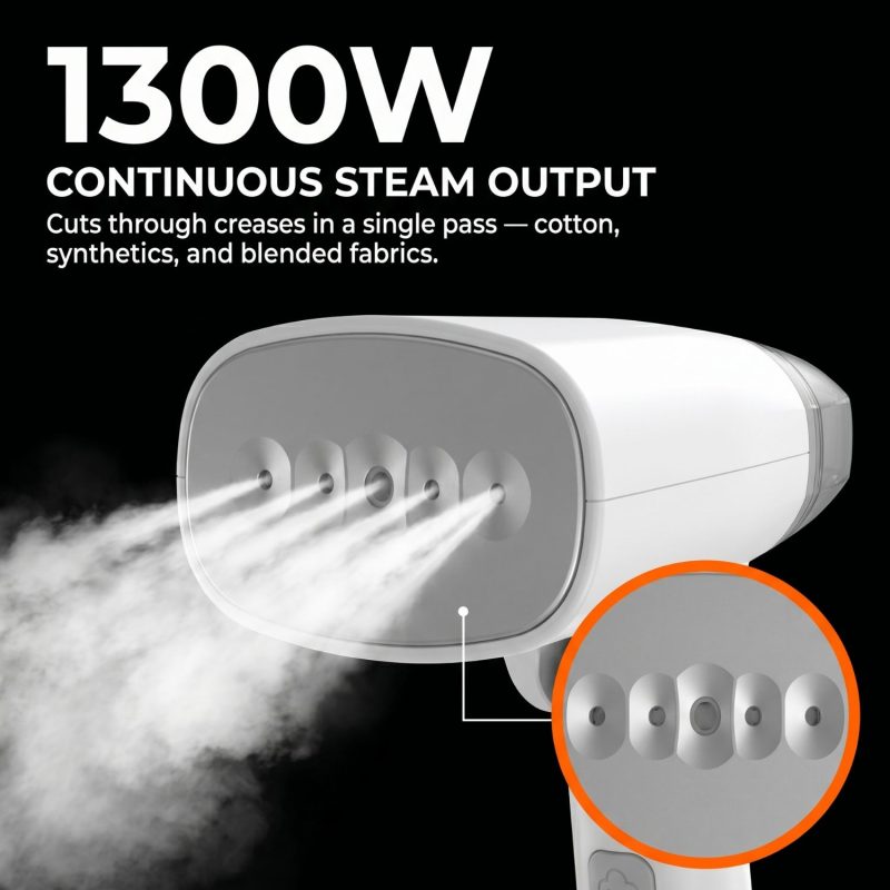 Το θερμαντικό στοιχείο 1300W παράγει ισχυρό, συνεχή ατμό που κόβει τις πτυχές με ένα μόνο πέρασμα στους περισσότερους τύπους υφασμάτων, από βαμβακερά πουκάμισα έως συνθετικά μείγματα.