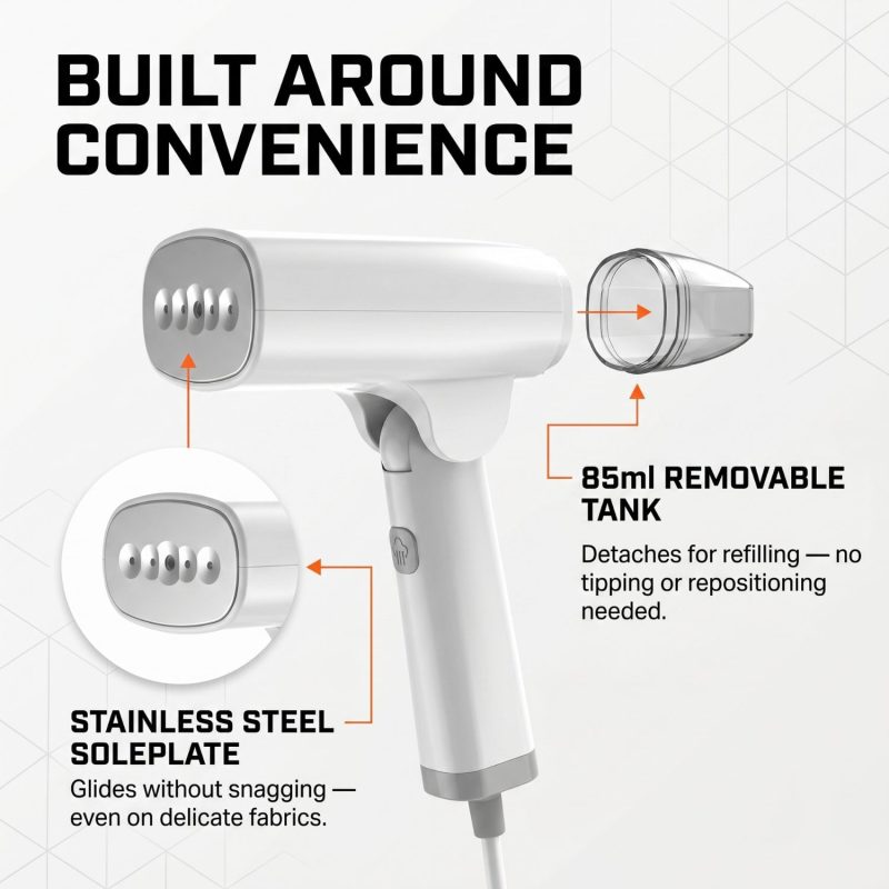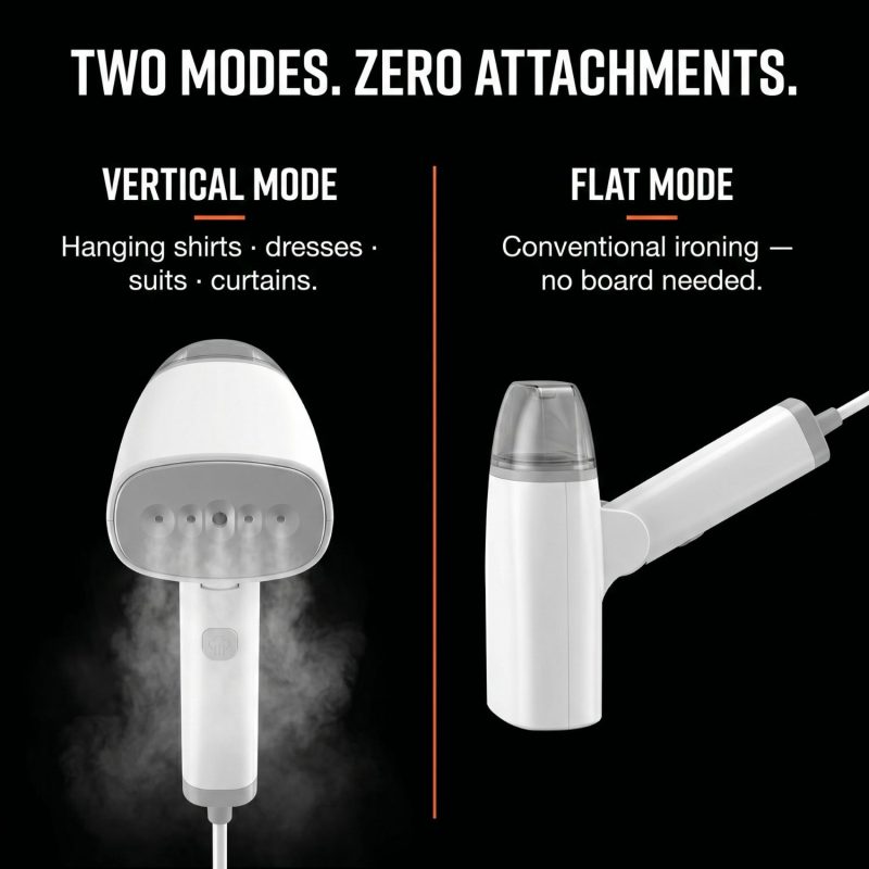 Ο σχεδιασμός διπλής λειτουργίας εξαλείφει έναν κοινό περιορισμό των ατμομάδων χειρός – την αδυναμία σιδερώματος σε επίπεδη μορφή. Αυτή η μονάδα λειτουργεί πιεσμένη πάνω σε επίπεδη επιφάνεια εξίσου καλά όπως και αν την κρατάτε πάνω σε ένα κρεμασμένο πουκάμισο ή φόρεμα, γεγονός που την καθιστά πραγματικά χρήσιμη σε διαφορετικούς τύπους ρούχων και καταστάσεις στο σπίτι και εκτός έδρας.