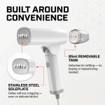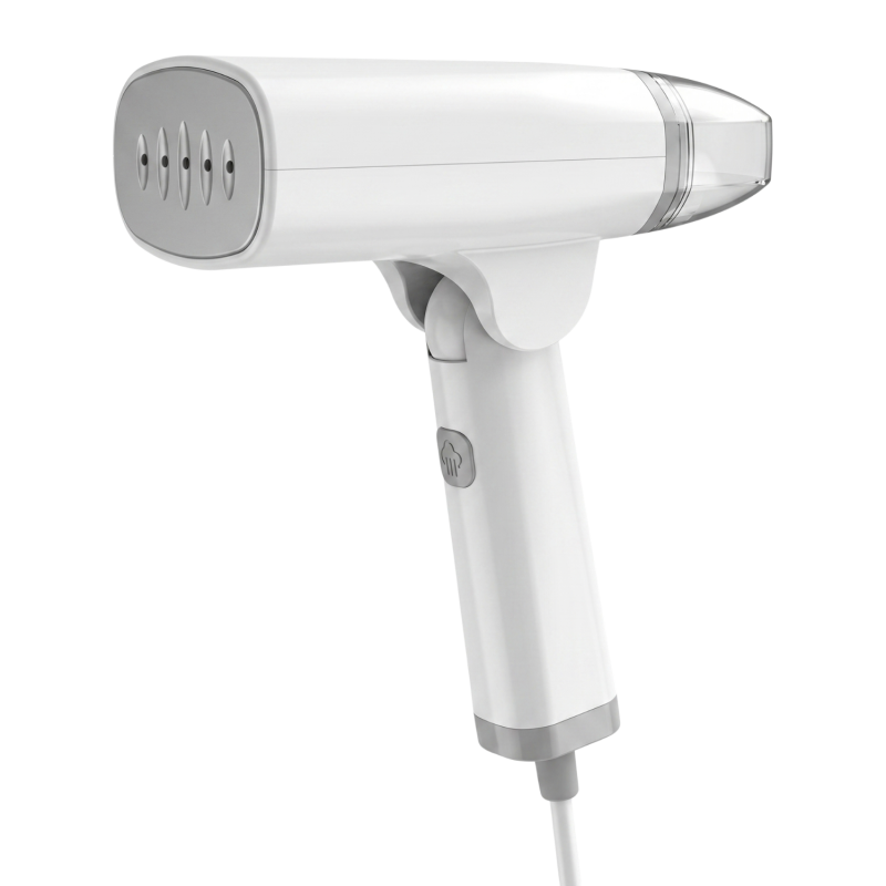 Ο ατμός αναπτύσσεται γρήγορα και διεισδύει στις ίνες του υφάσματος για να απαλλάξει από τις ρυτίδες τα πουκάμισα, τα παντελόνια, τα φορέματα, τα κοστούμια και τις κουρτίνες, χωρίς να χρειάζεται ειδική σιδερώστρα. Η πτυσσόμενη λαβή συμπτύσσει τον ατμομάγειρα σε μέγεθος 194 x 93 x 85 mm για αποθήκευση ή συσκευασία και η δεξαμενή νερού των 85 ml χωράει αρκετό νερό για να επεξεργαστείτε αρκετά ρούχα πριν χρειαστεί να την ξαναγεμίσετε. Το καλώδιο ρεύματος μήκους 1,5 μέτρων σας δίνει την ελευθερία να μετακινείστε γύρω από μια ντουλάπα ή μια κρεμαστή ράγα χωρίς να επανατοποθετείτε την πηγή ρεύματος.