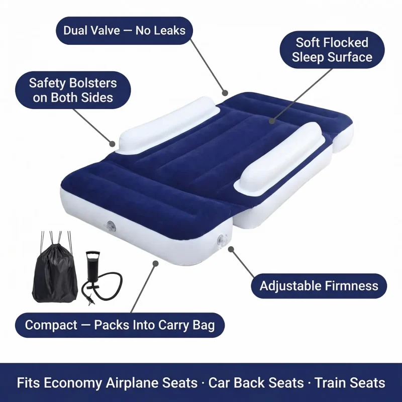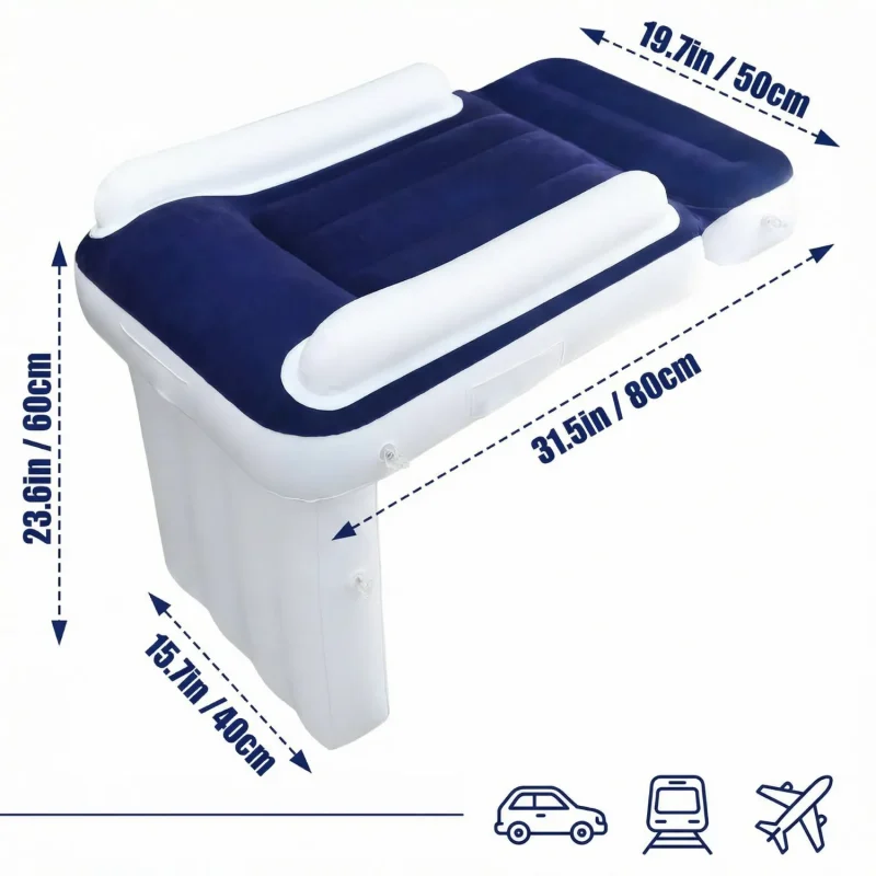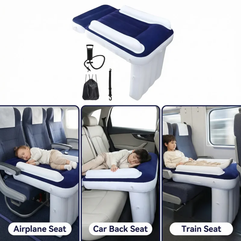 Give your child a flat, supported place to sleep on long journeys with the Kids Inflatable Travel Bed and Seat Extender. Built to bridge the gap between aircraft seat rows, car back seats, and high-speed rail carriages, this inflatable bed converts standard seating into a comfortable sleeping surface for toddlers and young children.