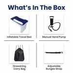 | Includes | Inflatable travel bed, hand pump, security strap, drawstring carry bag |