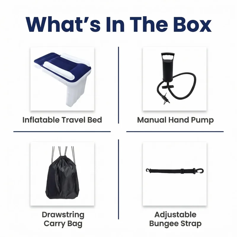 Each order includes the inflatable travel bed, a hand pump, a security strap, and a drawstring carry bag for storage and transport.
