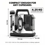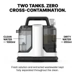 The dual-tank design keeps 1080ml of clean water and up to 850ml of recovered dirty water fully separated throughout the entire process. A 1.2-metre flexible hose and three interchangeable attachments – a wide carpet and upholstery head, a compact upholstery brush, and a narrow crevice nozzle – let you move across floor carpets, sofa cushions, dining chairs, and tight corners without changing machines or stopping mid-clean.