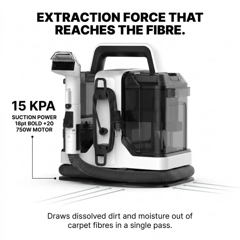 750W of motor output produces 15KPA of suction, drawing dissolved dirt and moisture up out of carpet fibres and upholstery fabric in a single pass.