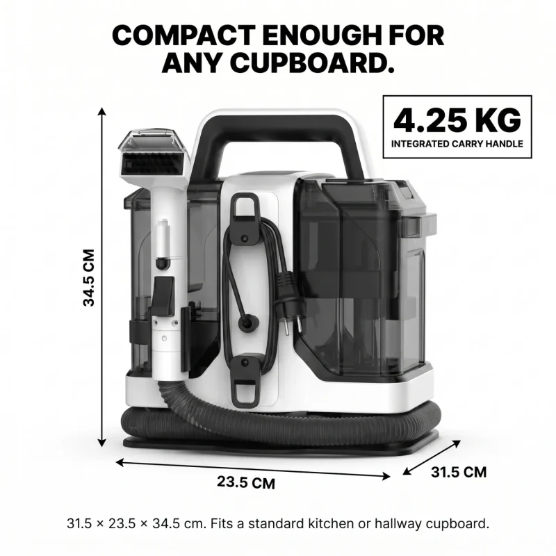 Fabric stains are a fact of life in Cyprus homes – sandy floors tracked in from the garden, spilled drinks on living room rugs, or everyday soiling on sofas and dining chairs. Professional wet cleaning services are costly and require advance booking, while standard vacuum cleaners do nothing for liquid stains or ground-in soiling. This portable spot cleaner gives you the results of a professional wet extraction clean in a machine small enough to live under your kitchen counter.