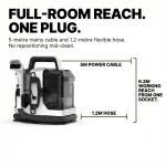- Extended Reach: A 5-metre power cable paired with a 1.2-metre hose covers a full room from a single socket position