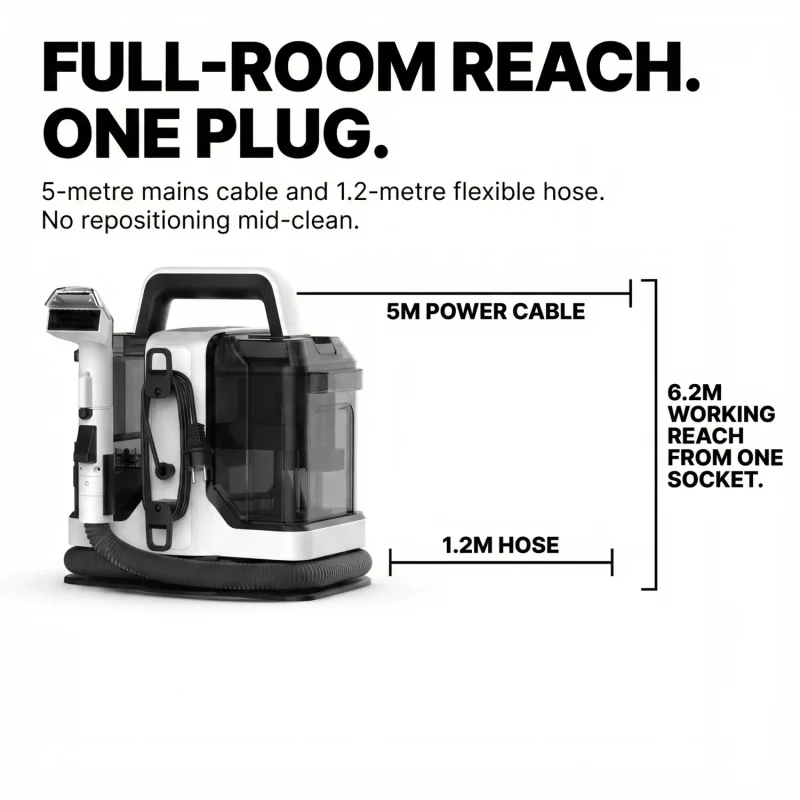The 5-metre power cable gives you working reach across a full room from a single plug socket, while the 1.2-metre hose keeps you mobile at any angle – flat along the floor, working upright on furniture, or reaching into a car boot. Because it operates on cold water only, there is no waiting for the machine to heat up and no risk of thermal damage to synthetic carpet fibres or delicate upholstery fabrics.