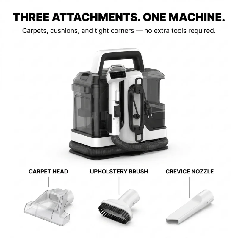 - Multi-Surface Attachments: One machine handles carpets, rugs, fabric sofas, cushions, and car seat upholstery