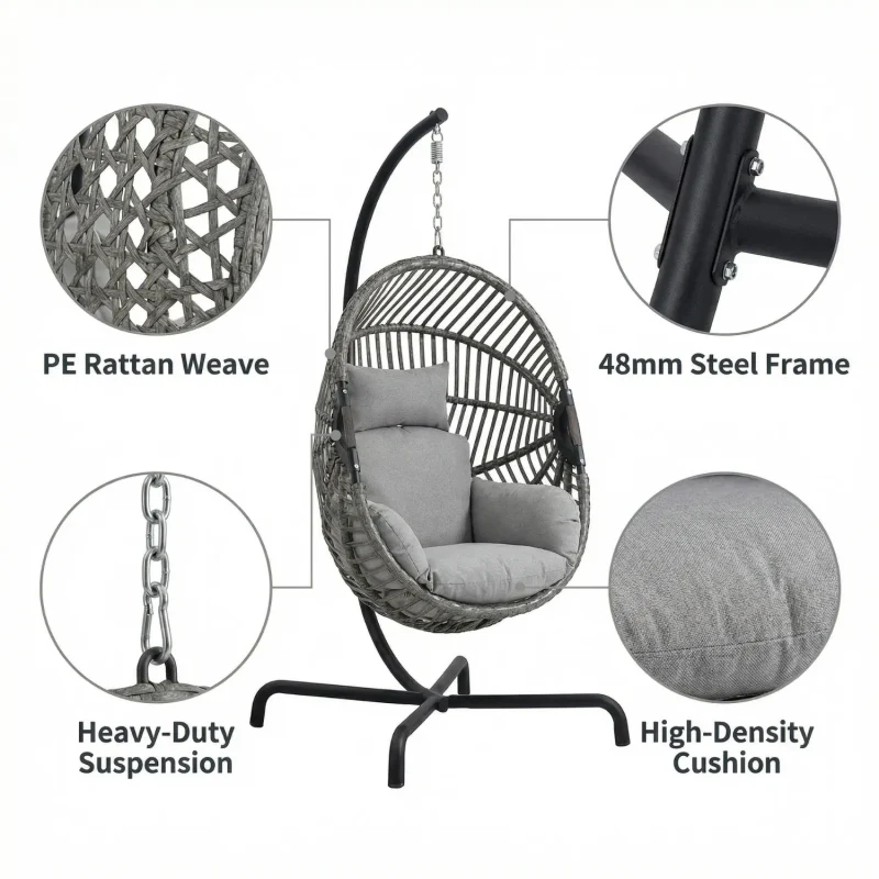| Includes | Egg chair basket, freestanding stand, seat cushion, headrest cushion |