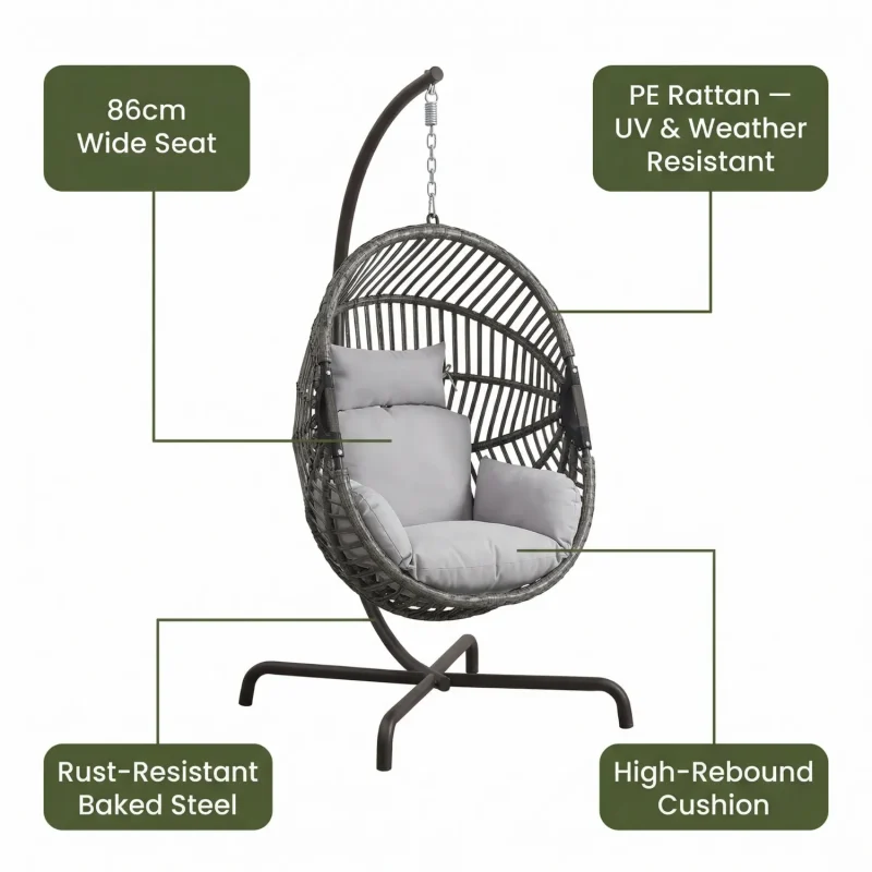 This Hanging Egg Chair is built with those conditions in mind. The PE rattan resists fading under direct sunlight, the baked paint steel frame sheds moisture rather than rusting, and the 86cm basket gives adults a properly spacious seat rather than an undersized perch.